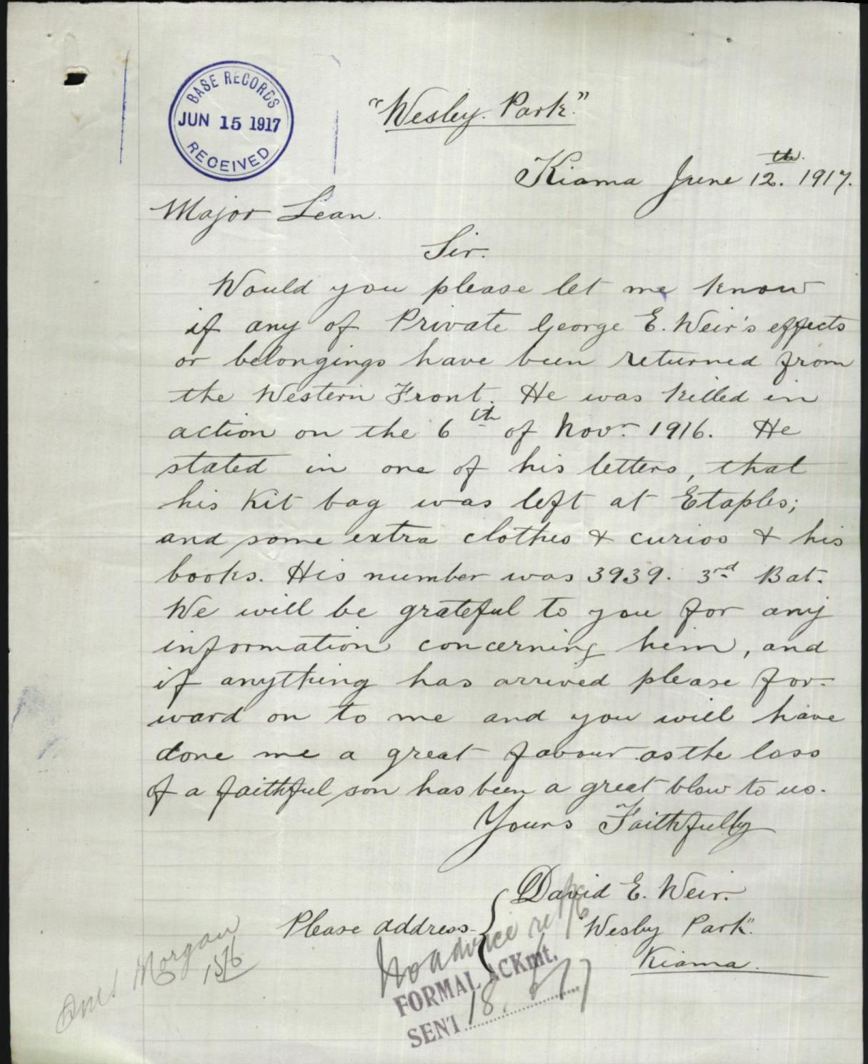 Caption: Addressed to the Australian Military regarding the return of George Weir's personal effects.