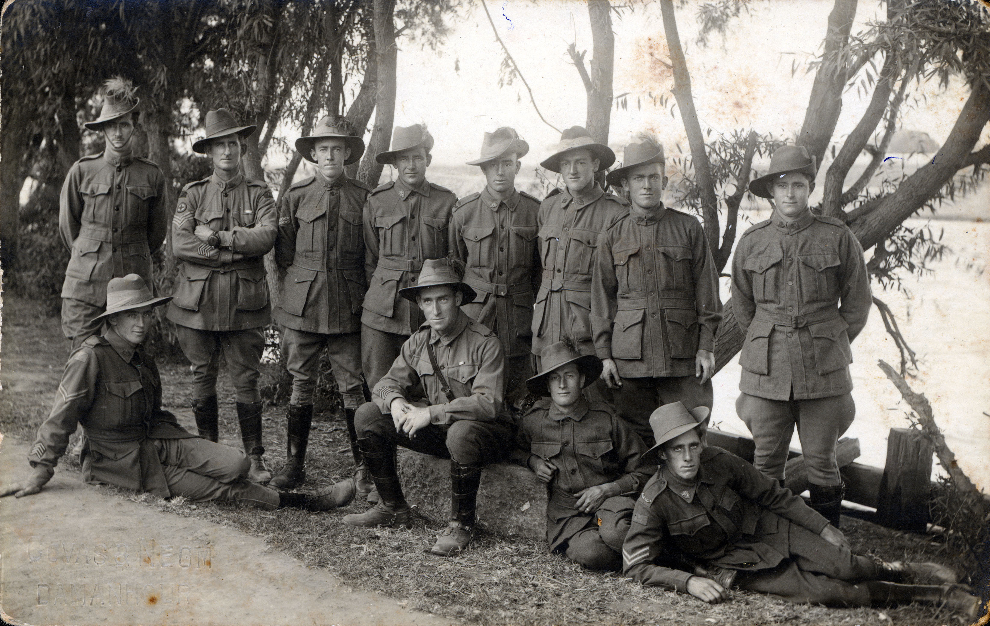 Caption: Tom is third from left. Information on the back: "A group of my mates. Jack Moon is five from left. To Con, From your TK." Taken at the Jordan River.