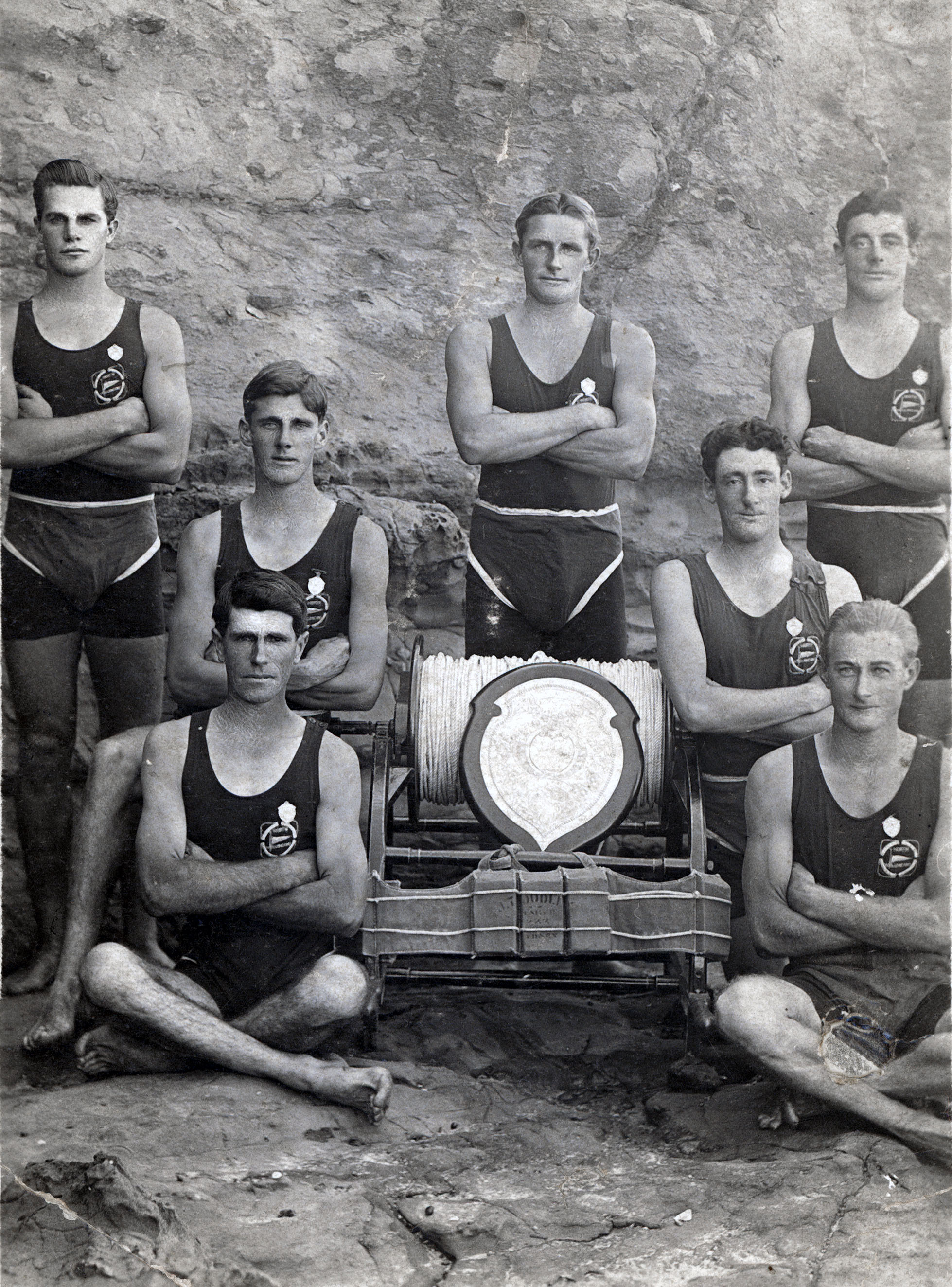 Caption: 1917 photo of North Wollongong Water Rats after winning 'Rescue and Resusetation' at Thirroul Easter Sports Carnival. Tom Irwin, seated second row on the left.