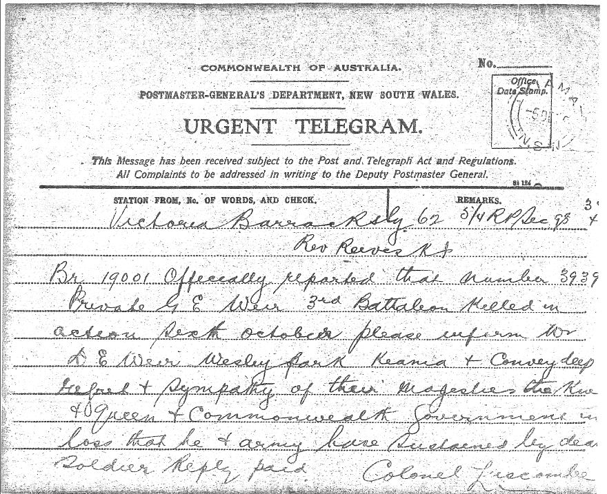 George has no known grave, but he is commemorated on the wall of the memorial at Villers-Bretonneux as follows: Pte GE Weir, 3rd Battalion AIF, Service Number 3939. He was just a few weeks short of his 22nd birthday.